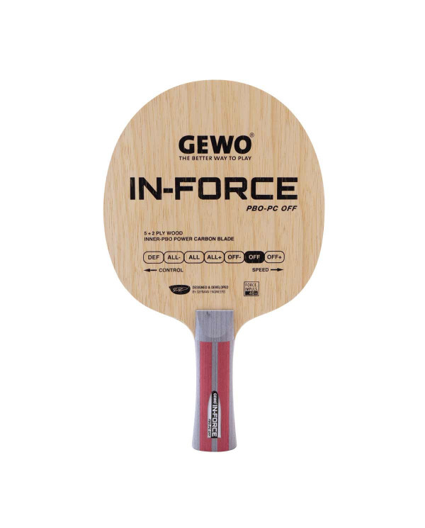 GEWO In-Force PBO-PC OFF – v tomto prípade sa nám podarilo naskladať vrstvy tak, že drevo dostalo mäkší cit, vyrovnané hodnoty rýchlosti a kontroly, s viac než dosť silou pre tvrdý útok.