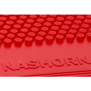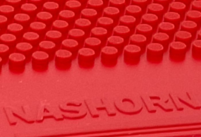 Sendvič.Novinka 2021. Štuple sú veľmi mierne kužeľovité. Sú tiež pomerne široké a len o málo vyššie ako povolené minimum 1,0 mm. Vzdialenosť medzi zúbkami je priemerná.Vrch zúbka je jemne drážkovaný.Štuple nosorožca majú takmer valcovitý tvar (pod lupou je viditeľné iba to, že sú veľmi mierne kužeľovité). Skutočne zvláštnou vecou nosorožca je gumová zmes. Táto bola kompletne zrekonštruovaná a je úplne odlišná od predtým použitých gumových zmesí. Vďaka vysokému podielu rôznych nových syntetických polymérov je neobvykle elastický, veľmi priľnavý a mäkký. Túto gumovú zmes sme vyvinuli sami v spolupráci s továrňou a pre ďalšie značky bude k dispozícii až oveľa neskôr. Účinnosť – lopta má veľmi nepríjemný plávajúci efekt.Tvrdosť špongie je približne 40 – 43 stupňov. S výškou 1,0 mm je však nosorožec veľmi vhodný aj na obranu.Silné stránky hry s blokmi sú najlepšie v hrúbke v 1,5 mm.