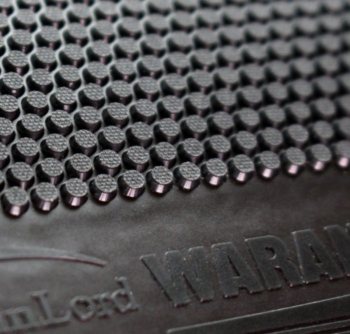 Sendvič.Väčšina moderných senvičov je kombinovaných s mäkkou vrchnou gumou a mäkkou špongiou. Novo vyvinutý Waran je iný, pretože vrchná guma je tvrdá a zuby sú veľmi krátke, trochu vytvarované do kuželovitého tvaru. Špongia je mäkká, s veľmi silným zabudovaným efektom lepenia, ktorého zvuk je počuteľný a viditeľný. Táto kombinácia robí poťah Waran najrýchlejším z našej ponuky Spinlord sendvičov. Napriek tomu disponuje poťah jednoduchým ovládaním a nie je citlivý na prichádzajúcu rotáciu súpera, dokonca Vaše údery dokážete veľmi presne umiestňovať. Rovnaký povrch, ale s vytváraním menšej rotácie má aj poťah Degu, ale nie je tak nebezpečný ako Waran, pretože lopty sú odrazené veľmi nebezpečne, plytšie a kratšie, ako súper očakáva. Waran je ideálnym poťahom pre: – kontrované protiútoky a bloky – agresívnu útočnú hru – pre všetkých, ktorý preferujú hru so endvičom na backhande. Pri vysokých loptách, možete rovnako z forehandovej strany úplne ľahko ukončiť úder, ako nikdy predtým. Klasifikácia : krátke zuby.